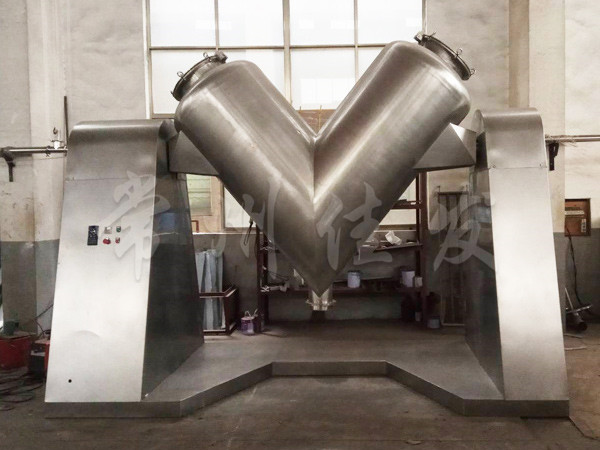 該機通過機械傳動,使不對稱的V型圓柱體內(nèi)的物料做往復(fù)翻動,達(dá)到均勻混合之目的。