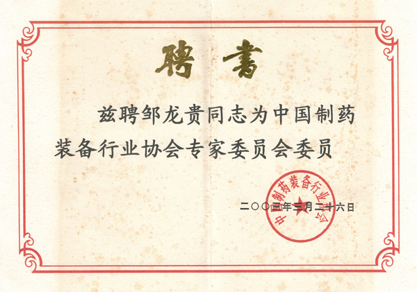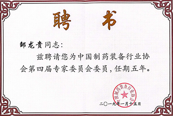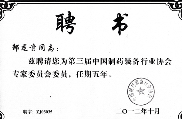制藥裝備協(xié)會(huì)專家委員聘書(shū)
